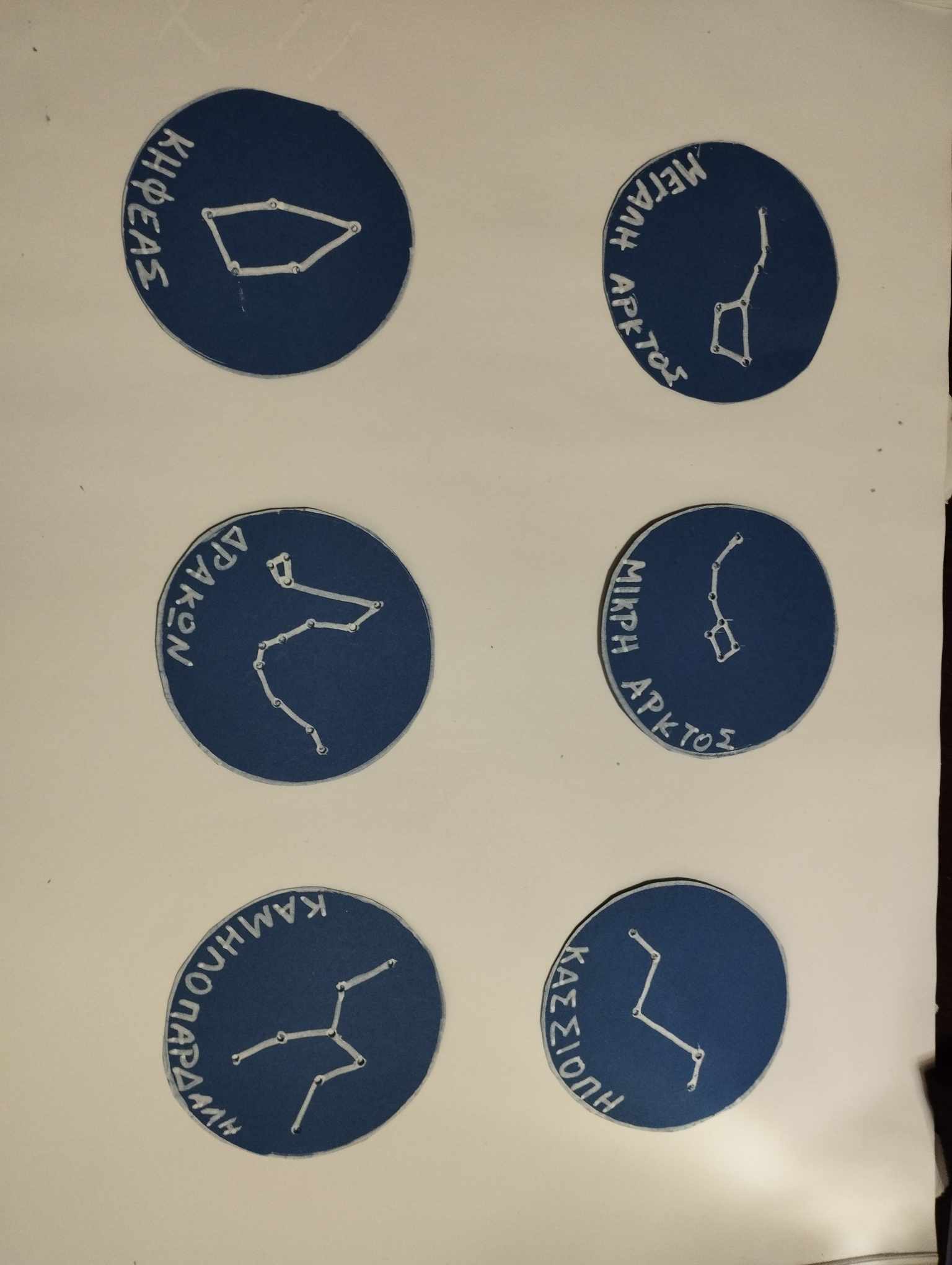 Στην αρχή οι μαθητές έκοψαν τον πάτο ενός χάρτινου ποτηριού. Στη συνέχεια, ζωγράφισαν σε στρογγυλά χαρτονάκια τους αστερισμούς με μαρκαδόρο και "τρύπησαν" τα αστέρια με μια πινέζα