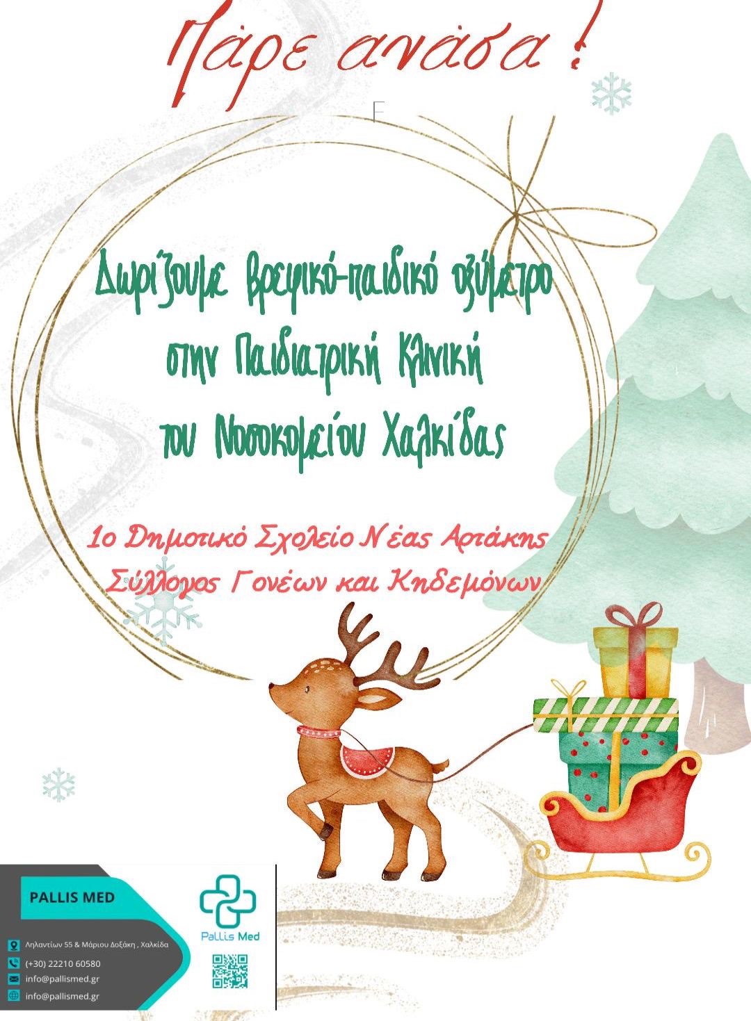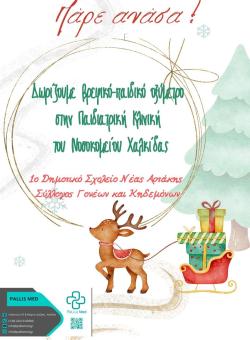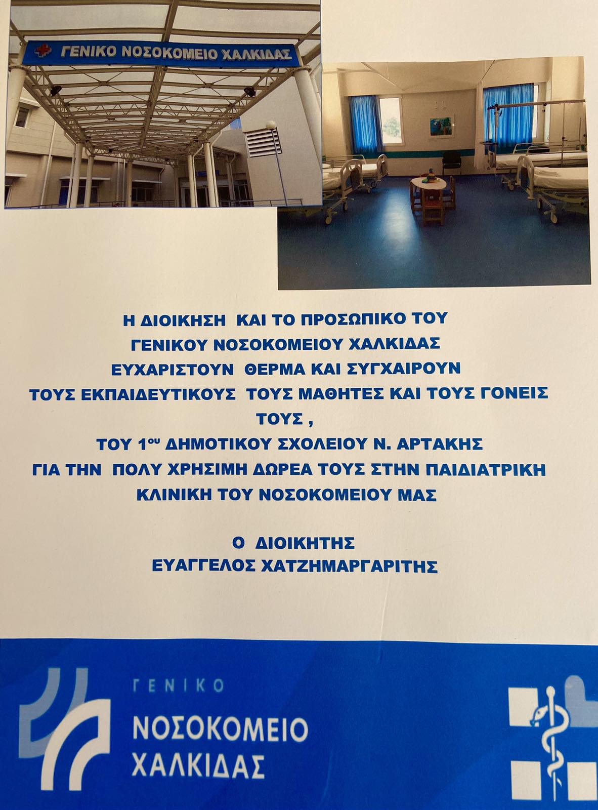 Στις 16 Δεκεμβρίου 2022 αντιπροσωπεία μαθητών/τριών, εκπαιδευτικών, μελών του Δ.Σ. του Συλλόγου Γονέων και Κηδεμόνων και ο Πρόεδρος της Εταιρείας Pallis Med επισκέφτηκαν το Νοσοκομείο Χαλκίδας και μέσα σε μια εορταστική ατμόσφαιρα πρόσφεραν στον Διοικητή του Νοσοκομείου και τη Δ/ντρια της Παιδιατρικής Κλινικής το οξύμετρο.
