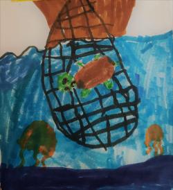 Η χελώνα εγκλωβίστηκε στα δίχτυα του ψαρά και δεν μπορεί κανείς να τη βοηθήσει. Ο θυμωμένος ψαράς που του κατέστρεψε τα δίχτυα τη μαχαιρώνει.
