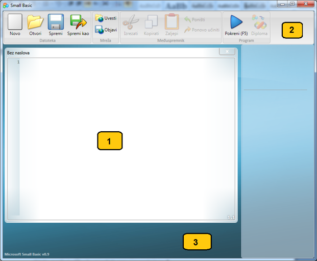 Na gornjoj slici vidimo okruženje programa Small Basic u kojem ćemo pisati i izvršavati programe napisane na jeziku Small Basic. Okruženje se sastoji od nekoliko ključnih elemenata označenih brojevima od 1 do 3.