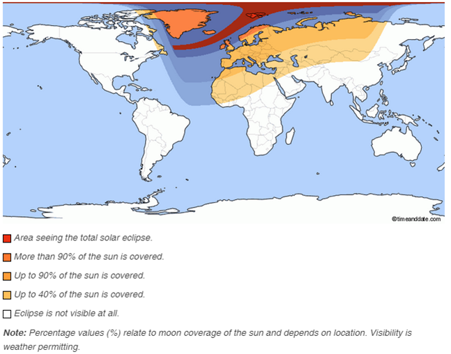 Η έκλειψη Ηλίου της 20ής Μαρτίου 2015 θα είναι ορατή από περιοχές της Γης που φαίνονται στον χάρτη.