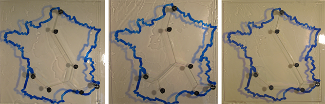 Put the model ine the soap basin and remove it. a soap film appears betwin the 2 layers of the model. This film will connect the different points on the map.