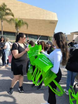 A revolutionary hands out a bag to a woman at the event