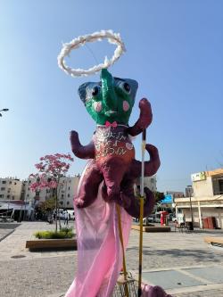 An imaginary angel doll (this was the concept of the festival, imaginary creatures, so it's an elephant combined with an octopus, not related to our campaign) with the slogan "Angels do not pollute" (of course in Hebrew it rhymes better than in English)