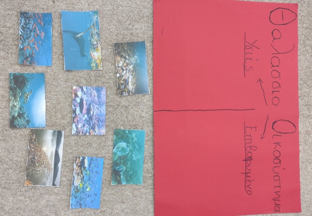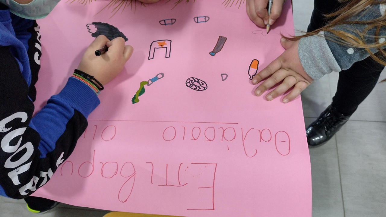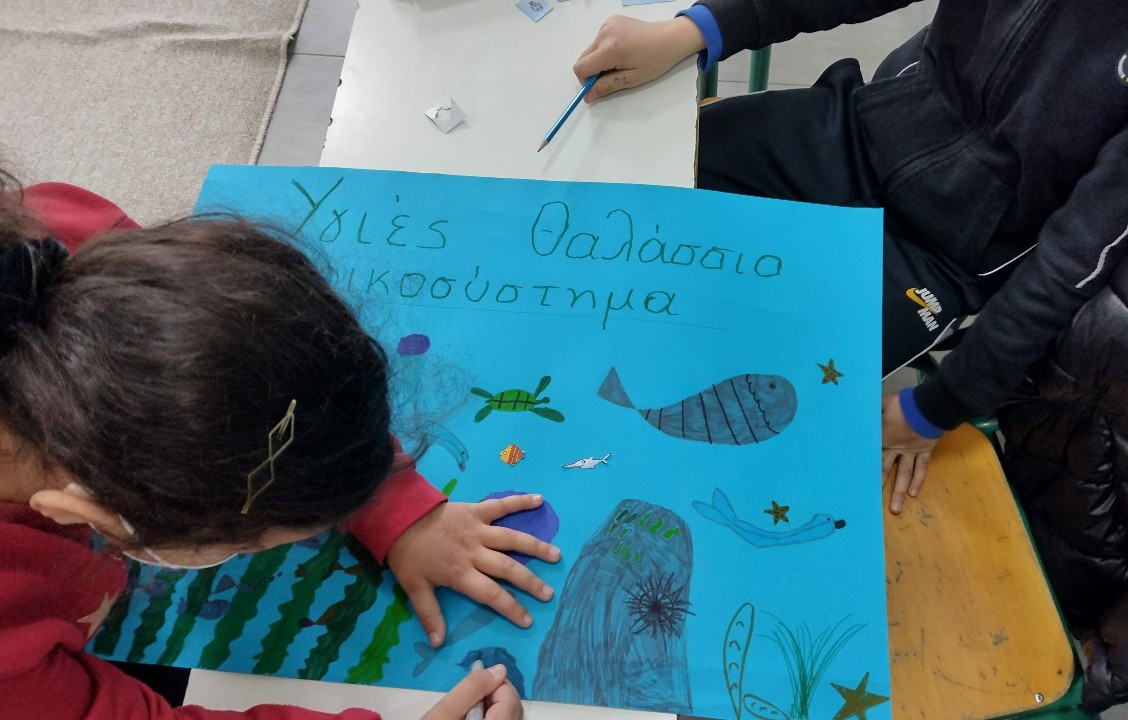 We first discussed the name and logo of our team. The children created it, painted it and agreed that from now on this will be our "signature"! Then we started talking about marine ecosystems. The students had photos of congested and healthy marine ecosystems and put them in the correct position, while drawing both versions. Then we introduced mussels and mussel farms. After that the children created a questionnaire with questions made up by themselves to find out what local people know and think about our topics. Students have already collected questionnaires and are very excited to hand them out to their families and to their village. Last time we took it little further and we talked about satellites, their species, their use and how we can use them in our research.